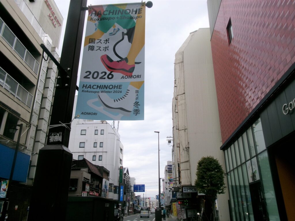 六日町通りの街路灯に国スポデザインのバナーフラッグを掲出しています