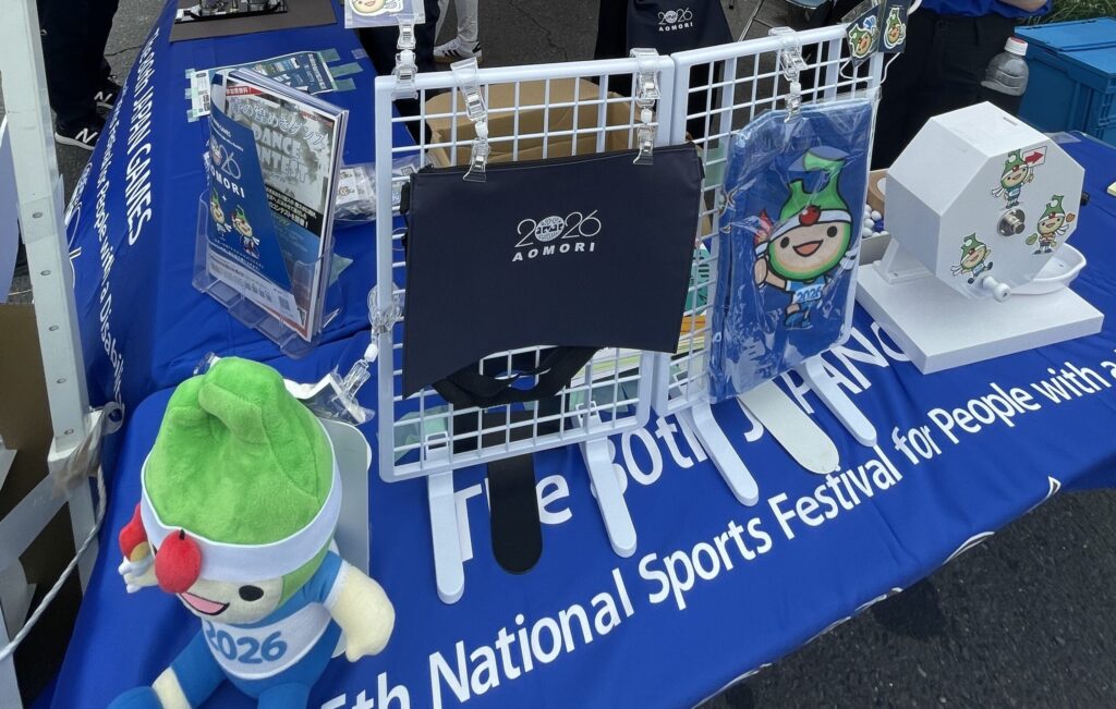 ブースでは国スポグッズの当たる福引やオリジナル缶バッジづくりを体験できるコーナーを設けるとともに、八戸市公式マスコットキャラクター「いかずきんズ」、「青の煌めきあおもり国スポ・障スポ」公式マスコットキャラクター「アップリート君」も登場し、来場者の方々に向けて国スポの周知を行いました。