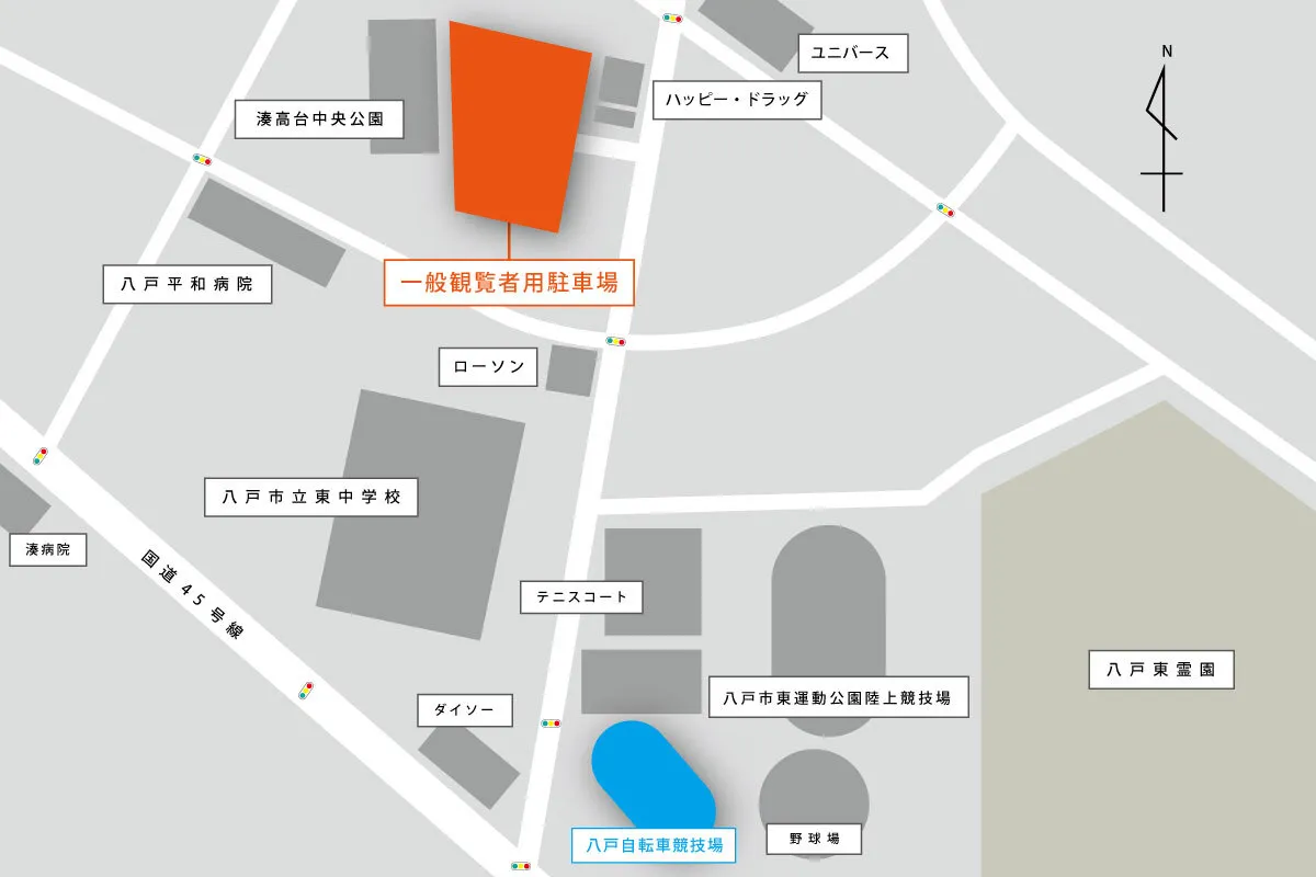 八戸自動車道・八戸南インターチェンジより約10分、約500台駐車可能(一般観覧車者駐車場)
