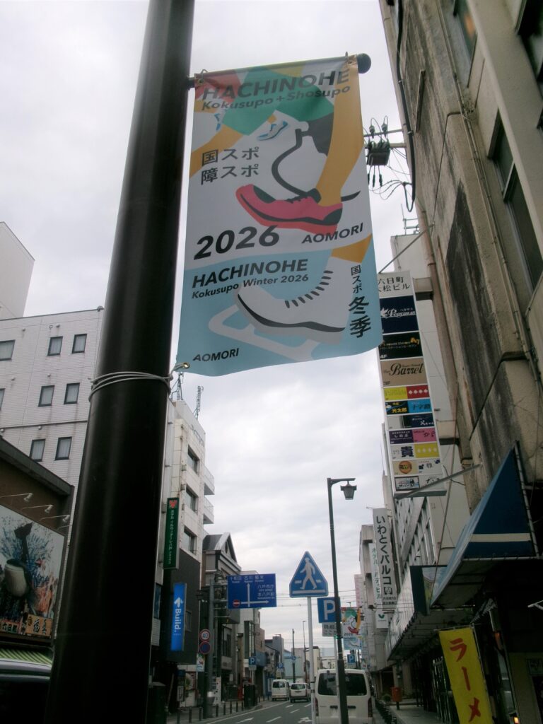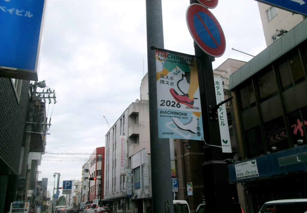六日町通りの街路灯に国スポデザインのバナーフラッグを掲出しています