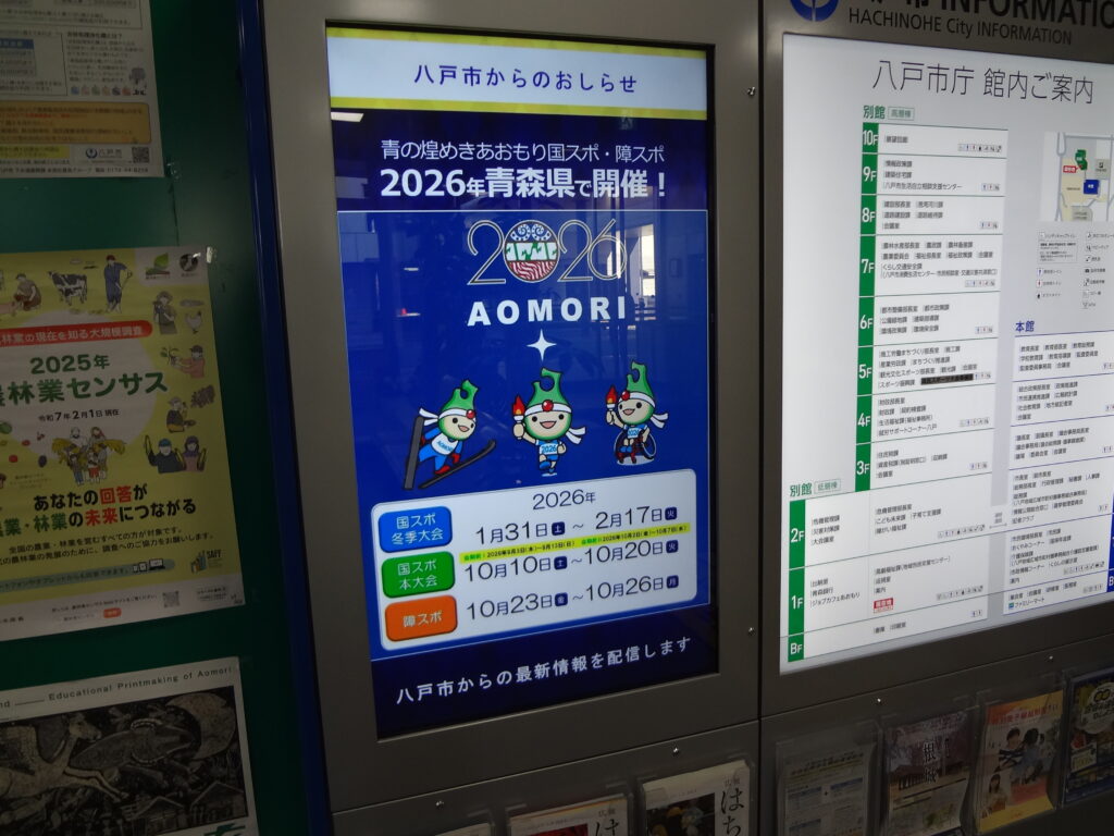 市役所本館・別館市政情報モニターや市総合保健センターのデジタルサイネージに国スポ開催のお知らせを掲載しています。
