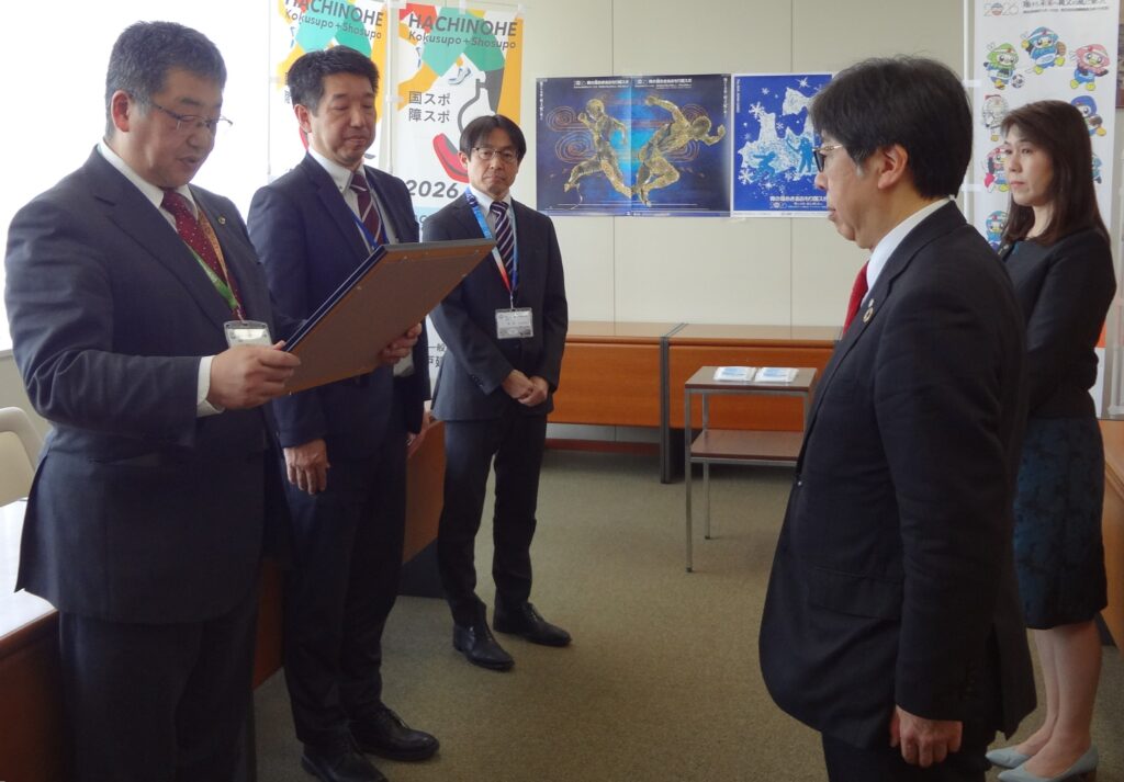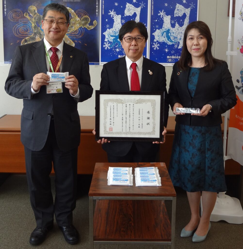 青の煌めきあおもり国スポ・障スポの開催に当たり、エイコウコンサルタンツ株式会社様よりウェットティッシュ1200個を御協賛いただき、5月23日に引渡しと感謝状贈呈式を行いました。