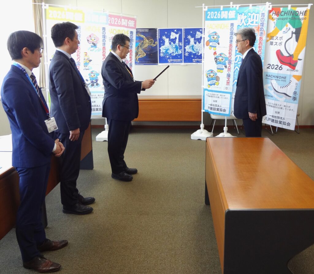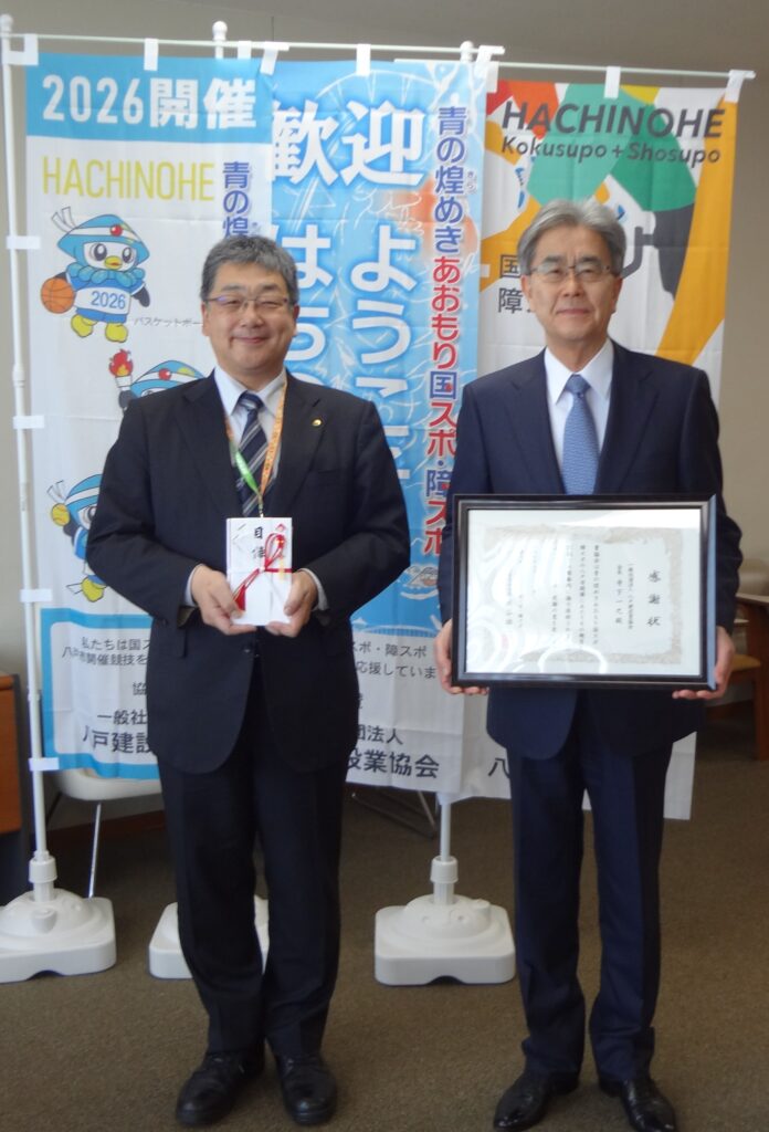 青の煌めきあおもり国スポ・障スポの開催に当たり、一般社団法人八戸建設業協会様よりのぼり旗