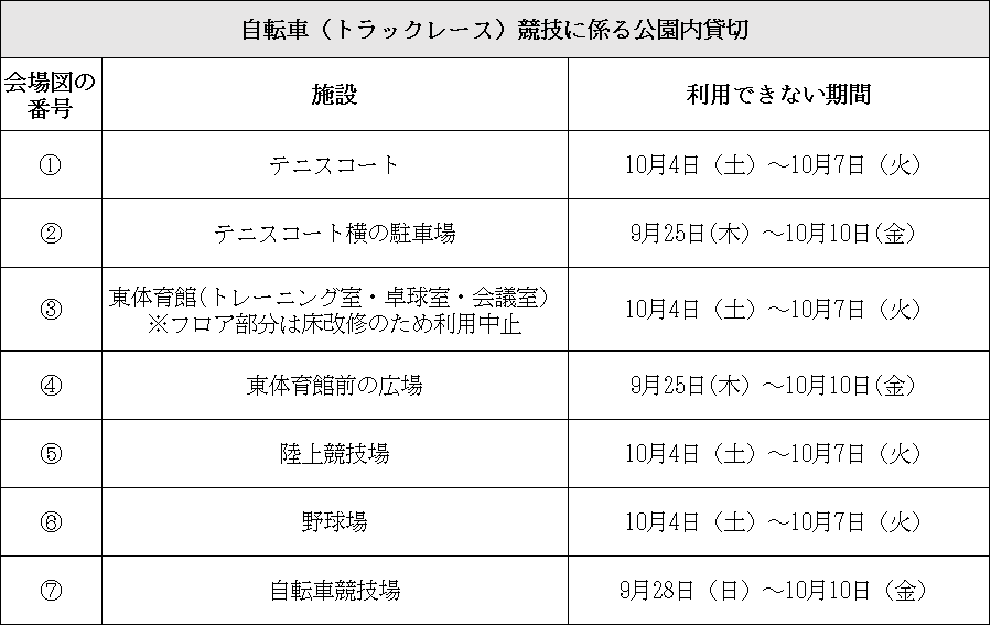 国スポリハーサル大会の開催に伴い、令和7年9月下旬から10月中旬の下記期間中、八戸市東運動公園の一部が利用できなくなります。