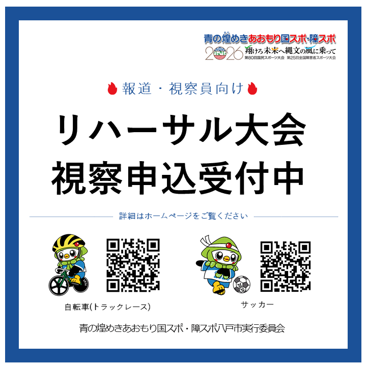 令和7年10月に八戸市で開催される国スポリハーサル大会(自転車トラックレース・サッカー)の視察申込の受付を行っています。